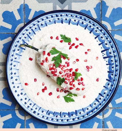 Figure 5.4 This delectable Mexican traditional dish is a stuffed poblano chile; picadillo is the mixture put inside the poblano which contains meat, aromatics (pomegranate seeds), fruits (apples, pears, and peaches), and spices. Topped on this dish is a walnut-based cream sauce and pomegranate seeds. You will find most Mexicans enjoying this dish between August and September when pomegranates appear in regional markets and independence festivities.