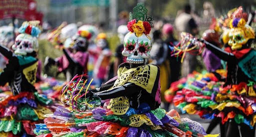 Figure 4.2 Several women are dressed in colorful, vibrant outfits and each adorn an intricately designed skull mask; they dance in the streets of Mexico City during the celebration of Dia de los Muertos. The significance of this celebration is deeply engrained in Mexican culture. This mutli-day holiday is a gathering of people to celebrate and remember their deceased relatives and aid their journeys into the spiritual realm. This holiday can be traced back to the Aztec festival dedicated to the goddess Mictecacihuatl whom ruled the underworld of Aztec mythology.