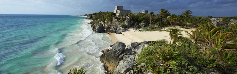 Figure 2.4 This panoramic shot gives us a glimpse into the beautiful atmosphere of Tulum with historical buildings situated off its coast. Tulum, which is located on the eastern coast of the Yucatan peninsula, was inhabited by the Maya and Toltecs. This ancient city was a central hub for trade in goods like cotton, food, copper, axes, and cacao beans. Because Tulum is protected by the jungles in Quintana Roo, this city managed to survive the Mayan collapse and mostly left untouched by the Spaniards. The Temple of the Winds in located in Tulum which was meant to honor the wind god that helped guide sailors through the reefs.