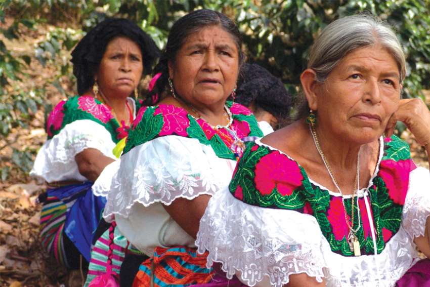 Figure 4.4 This photo shows several Tzeltal women in traditional dress called huipils, participating in a community assembly in Chiapas; this meeting was taking place to help bring awareness to poverty that is rampant among the indigenous peoples and the Mexican governments history of ignoring their plights. The Tzeltal people are indigenous to the Chiapas of Mexico and descendants of the Maya.
